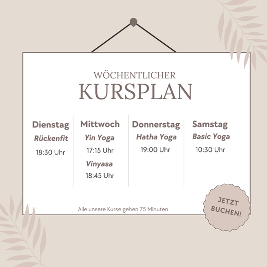 Sei am Anfang geduldig mit dir selbst. Lass dir Zeit um deine Yoga Praxis und die einzelnen Asana zu erleben und sprich uns bitte an, wenn sich eine Bewegung oder Position nicht richtig oder nicht gut anfühlt. Du musst dich nicht zu beginn "verbiegen" können. Vor allem am Anfang ist es wichtig auf seinen Körper zu hören und nicht gleich an die Grenzen zu gehen.